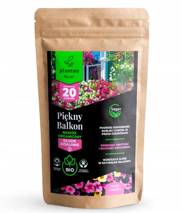 Planteo Piękny balkon pellet jako nawóz organiczny wzbogaca podłoże w szereg pierwiastków dedykowanych pod uprawę roślin balkonowych. Znajdujące się w jego składzie azot, siarka i cynk odpowiadają, m.in. za proces fotosyntezy, a co za tym idzie, za prawidłowy rozwój roślin.